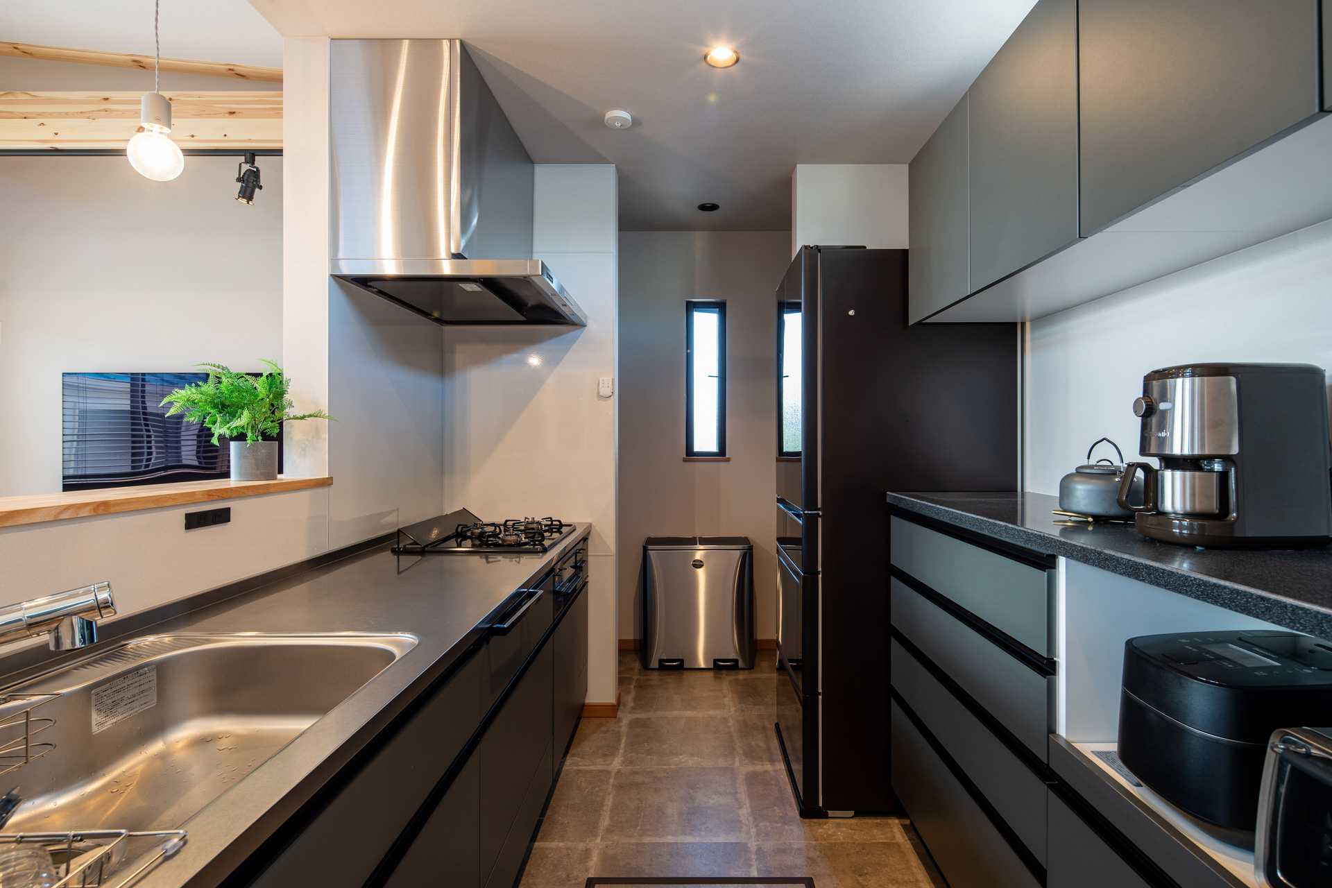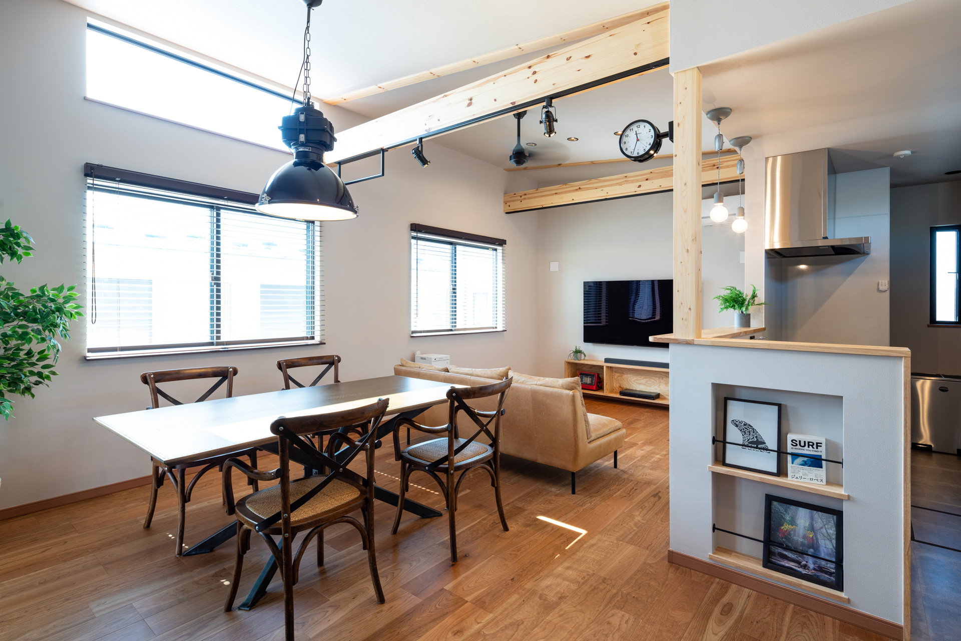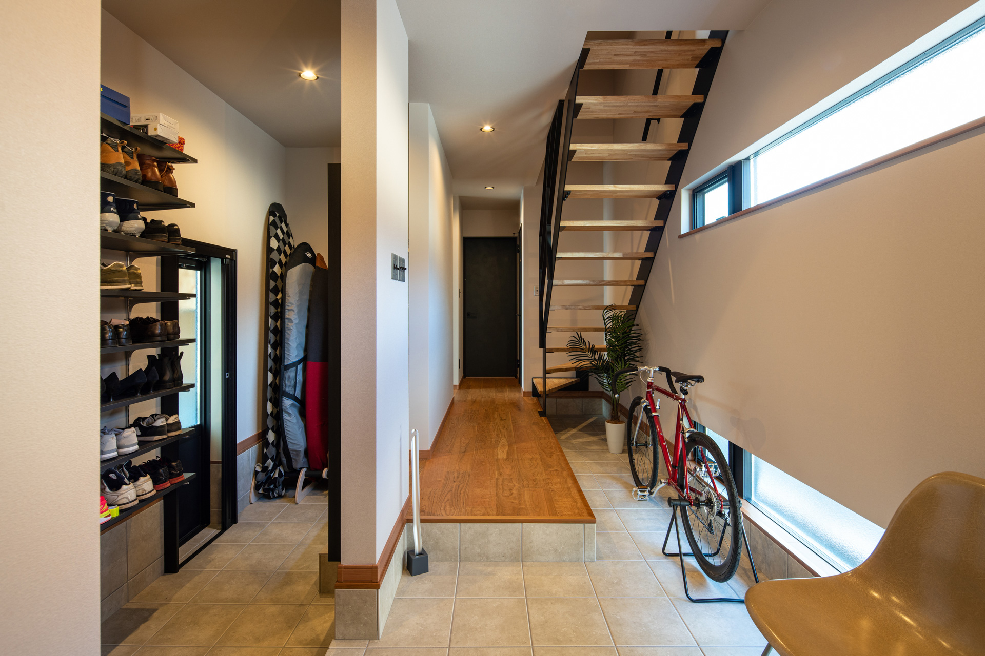 1階は広い土間収納と、バイクの格納や趣味スペースとしても活用できるガレージが特徴で、玄関から直接行き来できる室内ドアを設置しました。2階には勾配天井で明るく開放的なLDKを中心に、アウトドア気分を楽しめるインナーバルコニーや家事動線に配慮したランドリールームを配置し、快適で機能的な住まいを実現しています。