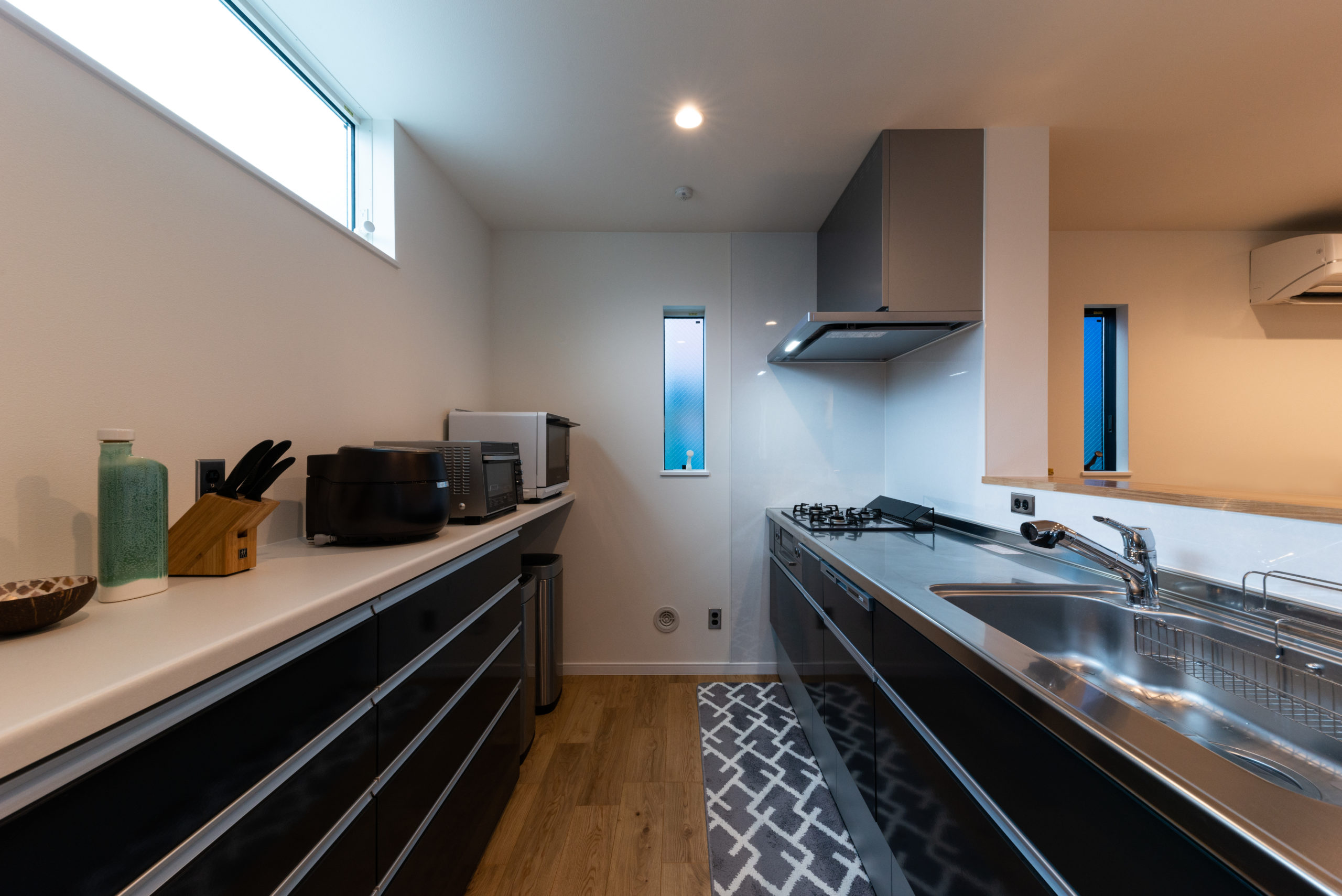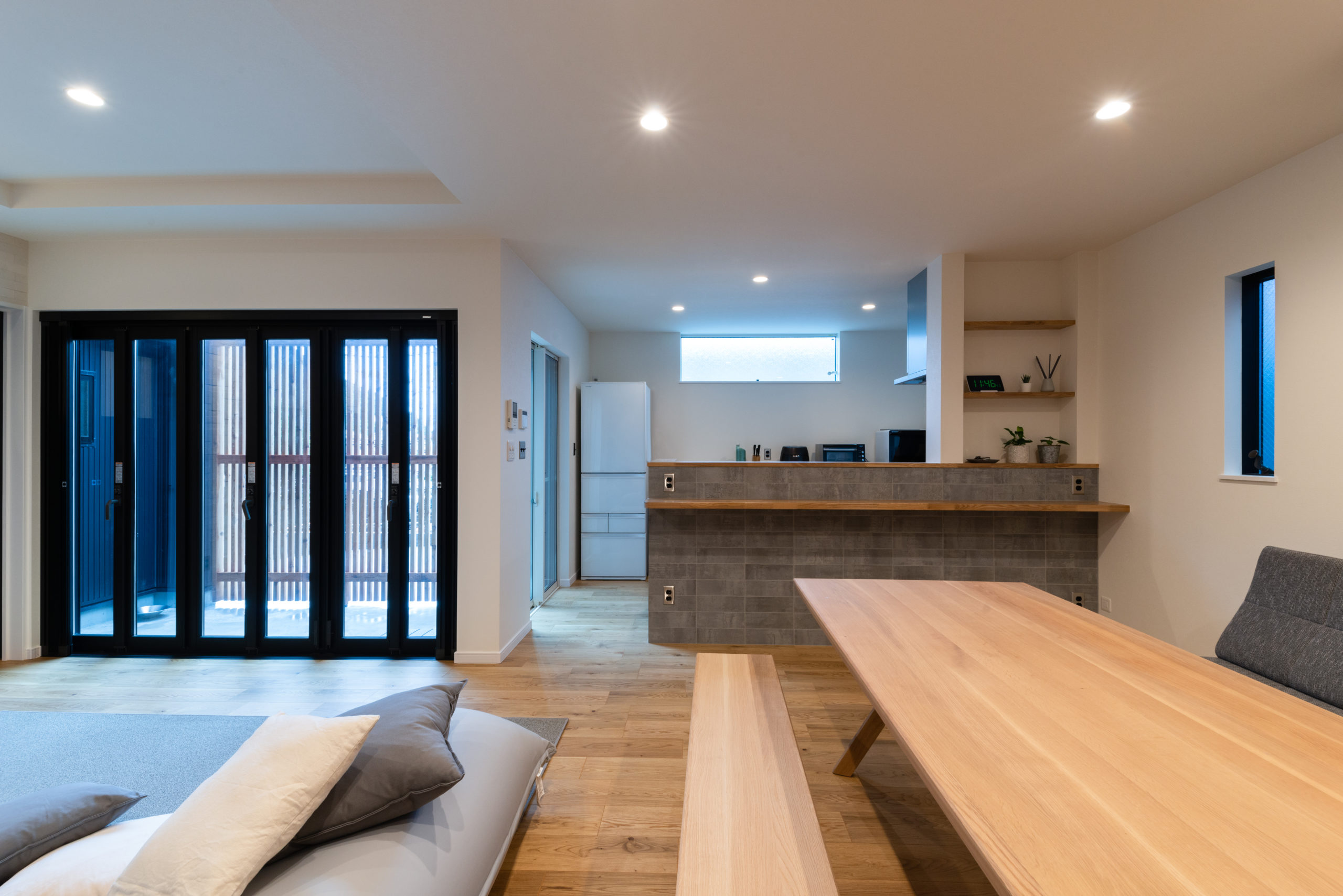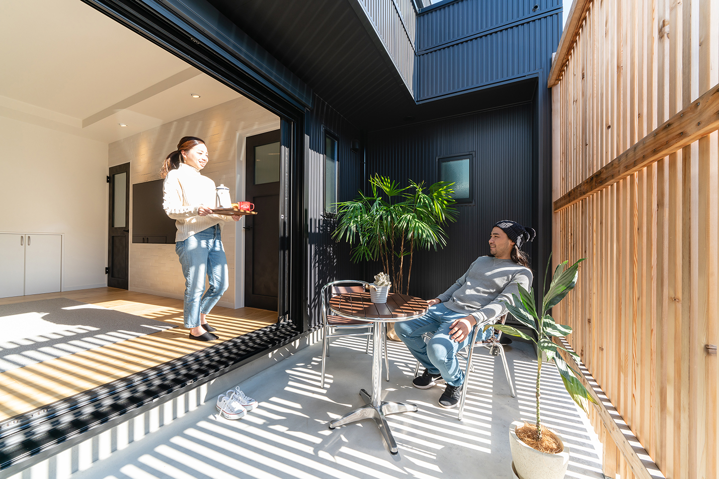 黒を基調としたモダンな外観と、プライバシーを確保しながらリラックスして暮らせる住まいを実現するため、外部の視線を遮りつつ開放感を楽しめる中庭を囲むコの字型プランをご提案しました。室内には自然光と風を心地よく取り込み、日射を考慮した設計と回遊性のある家事動線により、四季を感じながら快適に暮らせる住まいとなっています。
