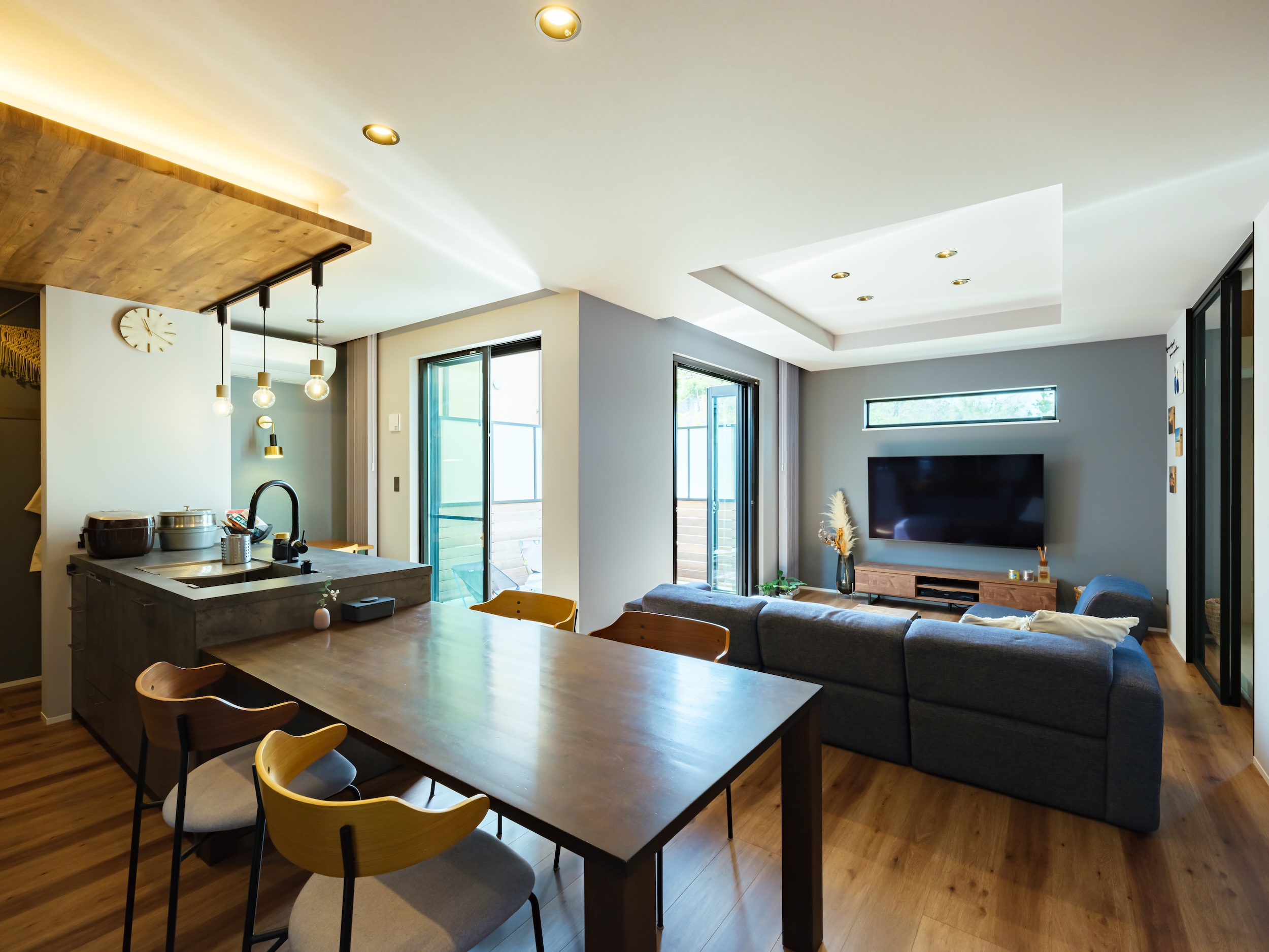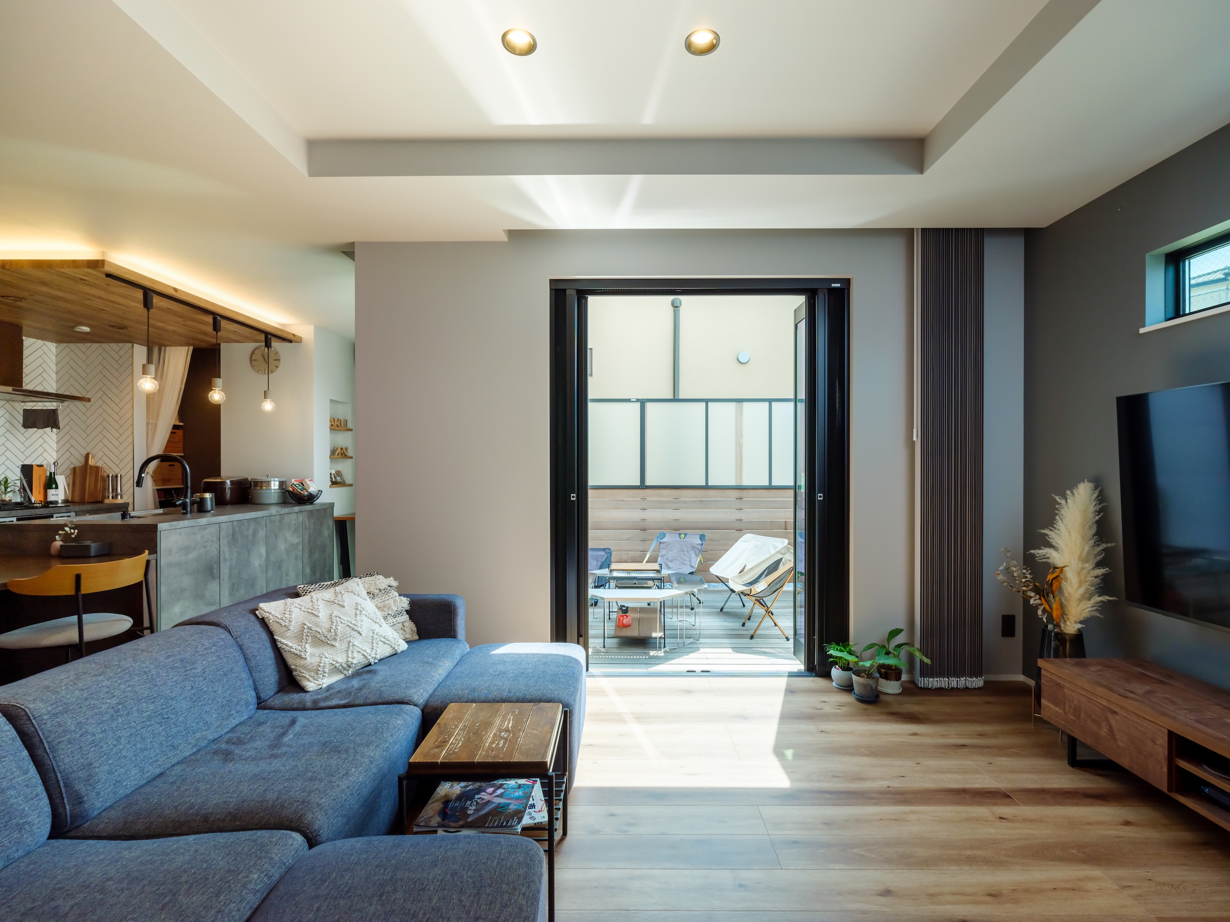 グレーの塗り壁と木調サイディングが調和した、個性的な外観の住宅が写っています。リビングには大きな窓があり、ウッドデッキへとつながっています。室内は、グレーと木材の組み合わせが落ち着いた雰囲気を醸し出し、アウトドアリビングとの一体感を生み出しています。洗練されたデザインと快適な居住空間が融合した住まいです。